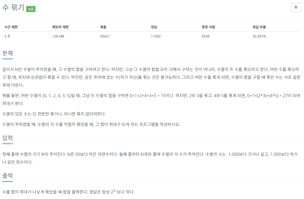 # 어떤 수를 묶게 되면, 수열의 합을 구할 때 묶은 수는 서로 곱한 후에 더한다. 수열의 모든 수는 단 한번만 묶거나, 아니면 묶지 않아야한다.